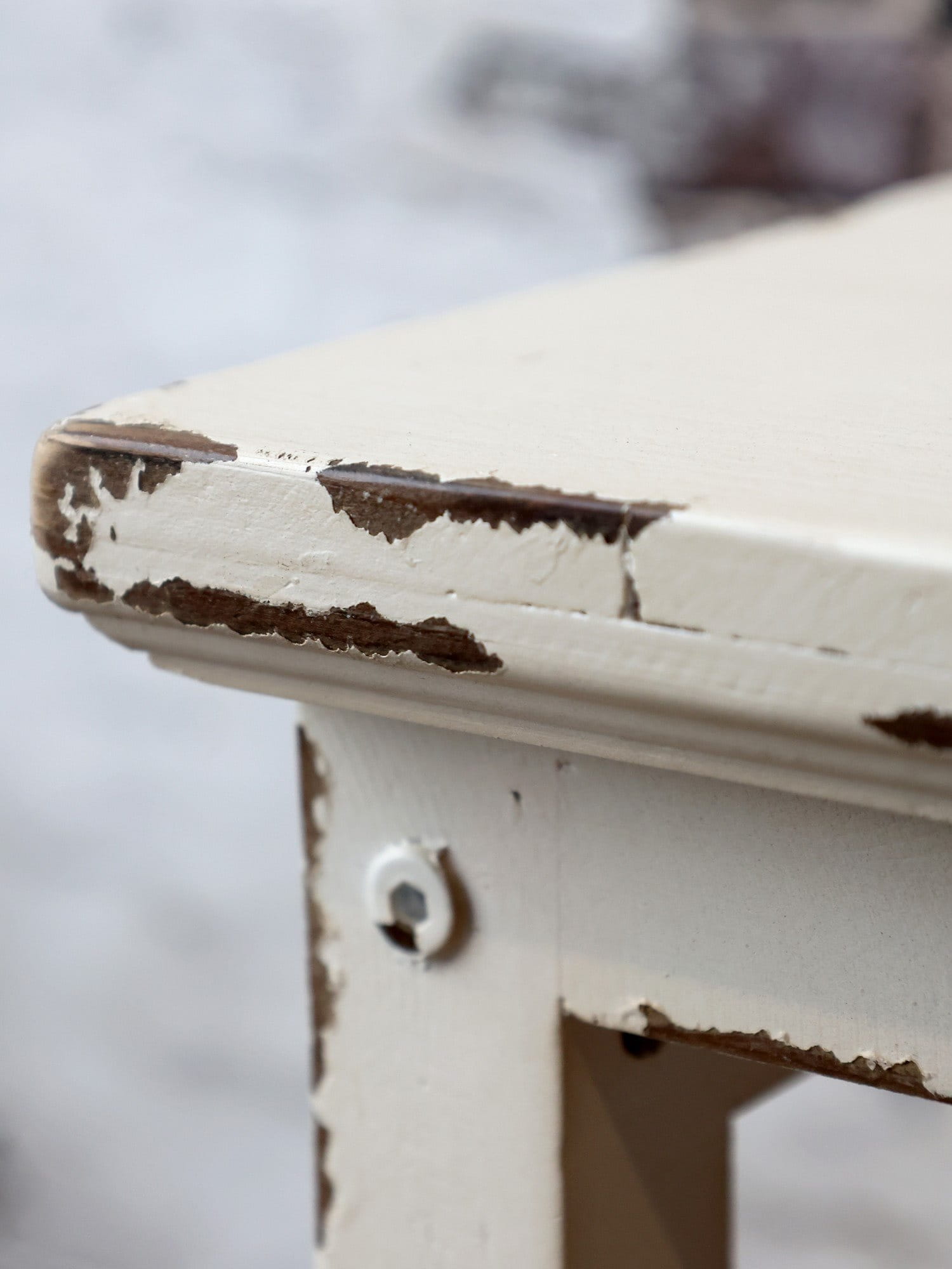 Postarzany stolik w delikatnym kremowym odcieniu na niskich nogach. Wyposażony w elegancką półkę, która nadaje mu dodatkową funkcjonalność. Jego minimalistyczny design sprawia, że doskonale wpisuje się w każde wnętrze, dodając mu subtelnego uroku.